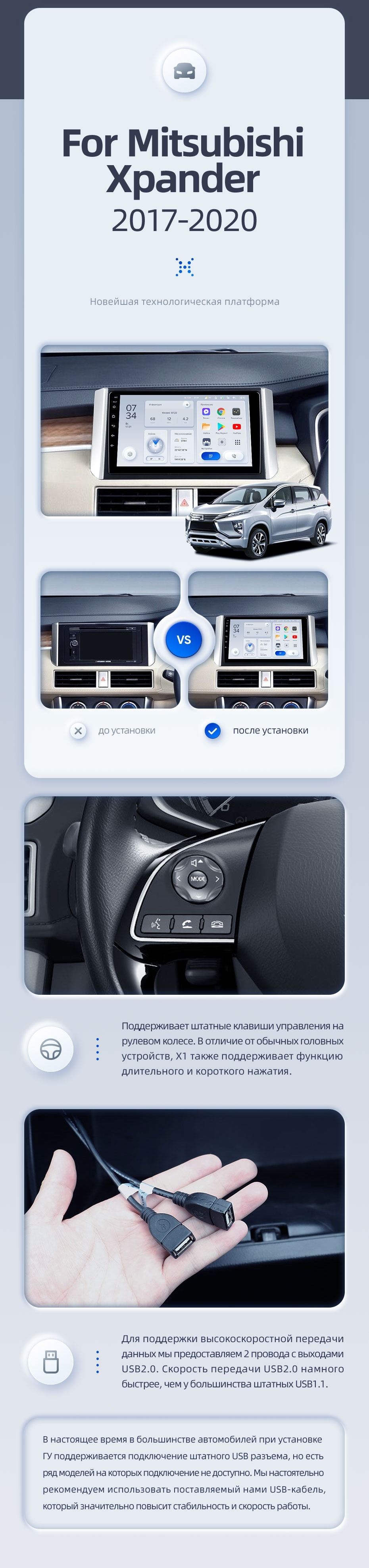 | USB | 3×USB 2.0 + USB 3.0 | Доп. аксессуары | Передняя/задняя AHD-камера, DVR-регистратор, TPMS, парковочный OBD, Type-C → HDMI |