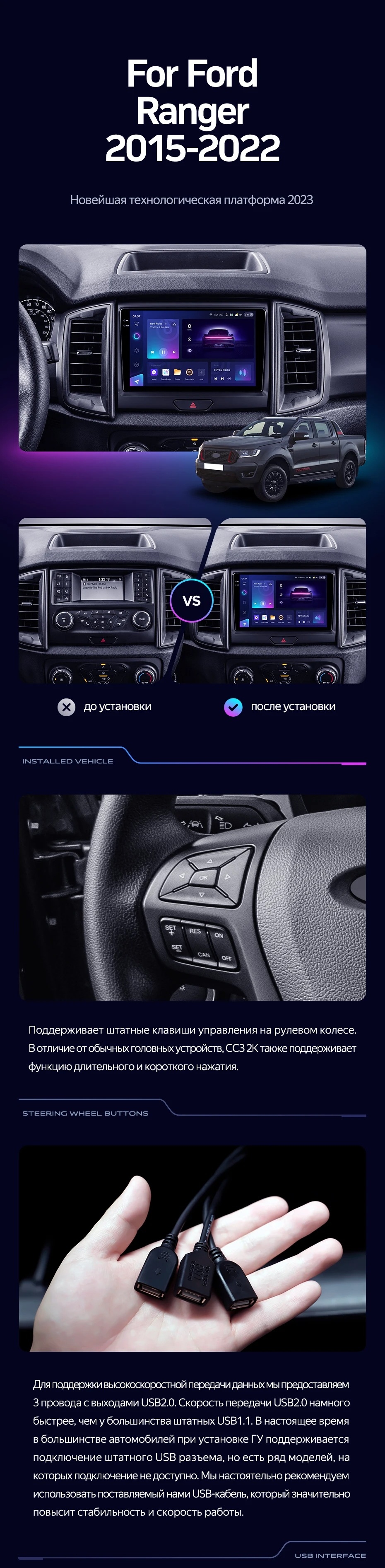 Полный комплект установки магнитолы Teyes с рамкой и проводкой можно выбрать в каталоге штатных магнитол Ford Ranger P703 (2015-2022).